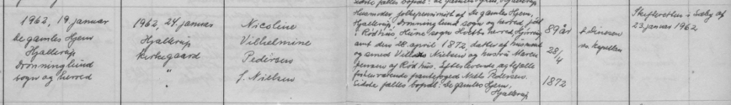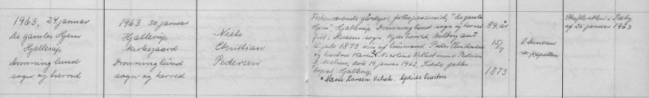 Hjallerup Kirkegaard, Dronning Lund og herred. Niels Christian Pedersen. Forhåndværende gårdejer, folkepensionist ”De Gamles Hjem” Hjallerup Dronninglund Sogn og herred, født i Horsens Sogn Kjær Herred Ålborg Amt 15-07-1873, søn af husmand Peder Christensen og hustru Karen Marie Larsen, Vibæk. Afdøde hustru Nicoline Vilhelmine Pedersen født Nielsen, død 19-01-1962. Sidste fælles bopæl Hjallerup 89 år 15-07-1873. A. Dinesen kapellan. Skifteretten i Sæby 25-01-1963.