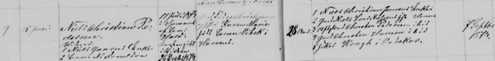 Født 15.juli 1873, Niels Christian Pedersen, vikar 1. Niels Larsens Enke 2.C.. Andersen. Døbt 17.juli 1873 i Hjemmet af L.. Hald, i..døbt i Kirken 26.december 1873. Gårdmand Peder Christensen og Hustru Karen Marie født Larsen, Vibæk, Horsens 28 år, Faddere 1. Niels Christians Jensens Enke 2. J.. Niels Lo.. Nielsens … 3.