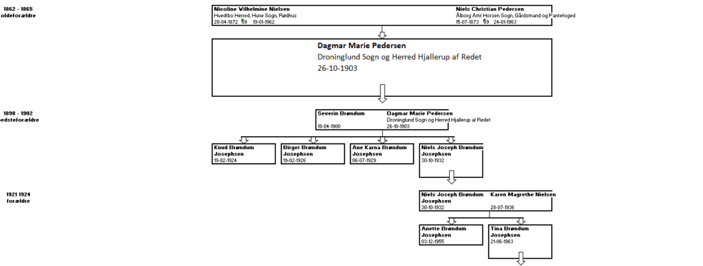 Iflg. Kirkebogen fra Nibe Kirke blev min far Niels Joseph Brøndum født den 30. oktober 1932. Familien boede på det tidspunkt i Lille Algade nr. 2 i Nibe. Min fars far, min farfar, Severin Josephsen er fra Fjerritslev i Nordjylland og er på dette tidspunkt ølhandler og hans mor, min farmor, er Dagmar Marie Pedersen er fra Hjallerup I Nordjylland. Min far blev døbt den 26. februar 1933 i Nibe Kirke af sognepræsten og som faddere var min farmor som bar min far, min farfar og vognmand Karl Pedersen i Kjølby, Josephsen. Min far får både navnet Josephsen efter min fars farfar, min oldefar, og Brøndum efter min fars farmor, min oldemor. Min fars tre ældre søskende var Knud født den 19. februar 1924, Birger født den 19. februar 1926, og Ane Karna født den 6.juli 1929 i Mellemgade 20 i Nibe, alle får navnene Brøndum Josephsen. Alle børnene får udover min farfars familienavn Josephsen også som mellemnavn hans mors familienavn Brøndum.