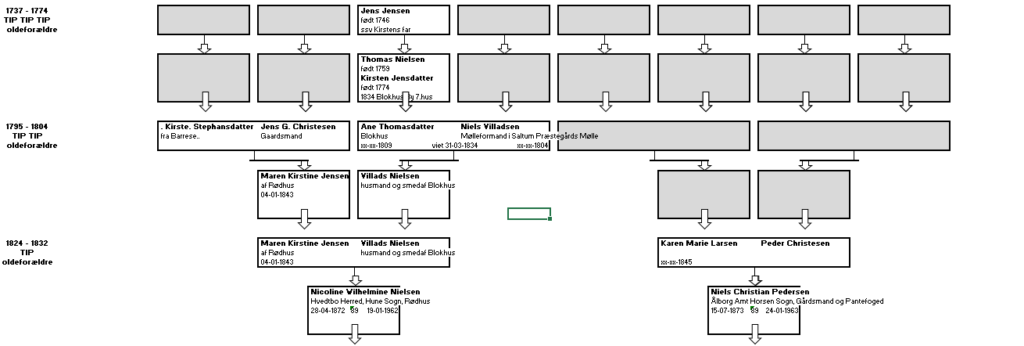 Min farmors mormor Maren Kirstine Jensen’s mor og far er Kirsten Stephansdatter fra Baresse (?) (gårdens navn (?) og Jens Godsen Christensen født i Blokhus, Gårdsmand er formodentligt født i perioden 1800-20.