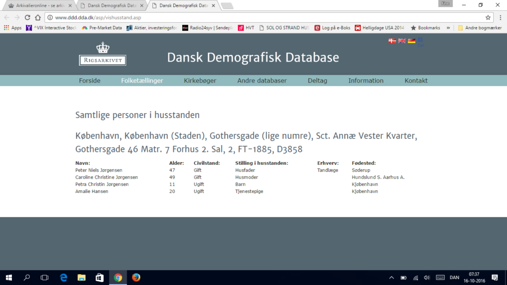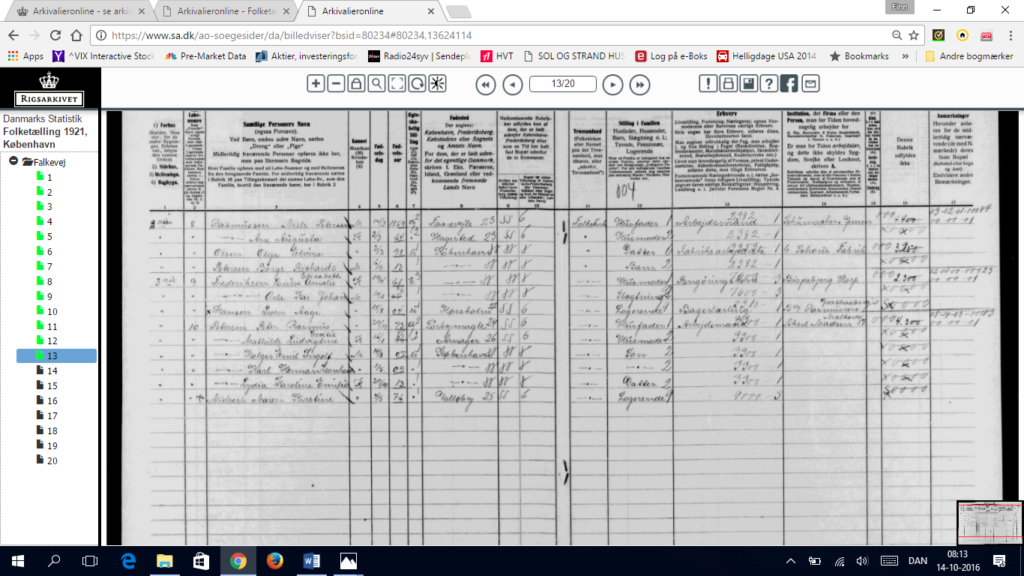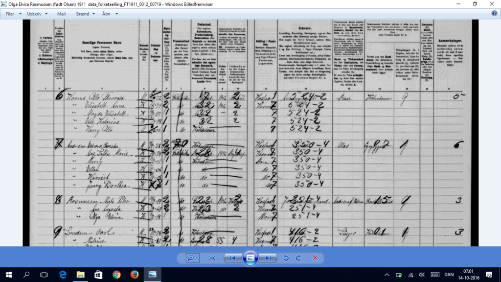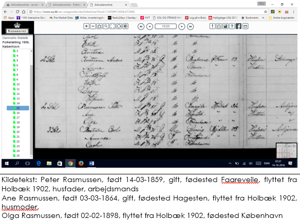 Det vi ved er, at vores mormor voksede op hos sin plejefamilie Niels Peter Rasmussen og Augusta Ane født Andreasen. De boede alle tre i Holbæk sandsynligvis på landet i Hagested hos sin familie og flyttede til Falkevej 7, 2.sal Brønshøj Sogn Utterslev Mark på Nørrebro i København, hvor hun boede sammen med sin familie til efter 1921, hvor familien stadig står opført på adressen i folketællingerne jf. nedenstående.