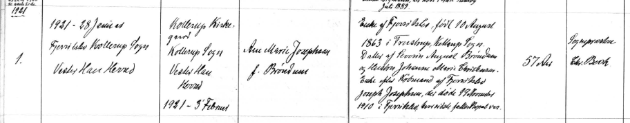 28.Januar 1921, Fjerritslev, Kollerup Sogn, Vester Han Herred – Kollerup Kirkegaard, Kollerup Sogn, Vester Han Herred, 1921 3.Februar – Ane Marie Josephsen født Brøndum – Enke af Fjerritslev, født 10.august 1863 i Torsrup Kettrup Sogn, Datter af Severin August Brøndum og Hustru Johanne Marie Christensen. Enke efter Købmand af Fjerritslev Josph Josephsen der døde 19.November 1910 i Fjerritslev, hvor sidste fælles bopæl var.