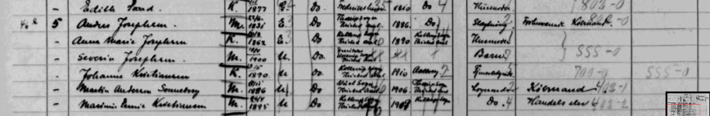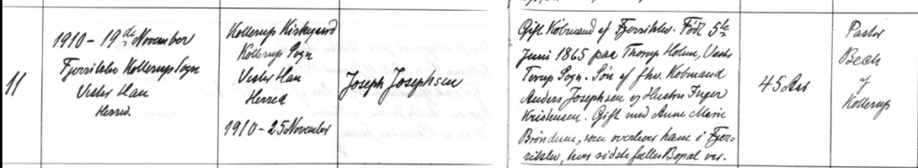 19.November 1910, Fjerritslev, Kollerup Sogn, Vester Han Herred – Kollerup Kirkegaard, Kollerup Sogn, Vester Han Herred, 1910 25.November – Joseph Josephsen – Gift Købmand af Fjerritslev. Født 5.Juni 1865 paa Thorup Holme, Vester Torup Sogn. Søn af fhv. Købmand Anders Josephsen og Hustru Inger Kristensen. Gift med Ane Marie Brøndum, som overlever ham i Fjerritslev, hvor sidste fælles Bopæl var.