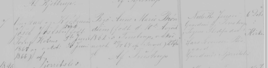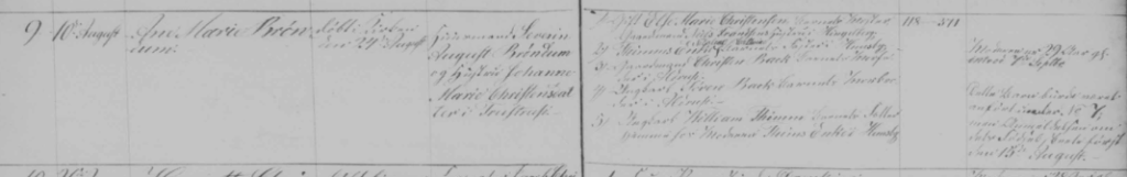 10.August 1862 – Ane Marie Brøndum – døbt i Kirken den 24.August – Gaardsmand Severin August Brøndum og Hustru Johanne Marie Christensdatter i Trustrup – 1. xx Marie Christensen xx, 2. Thimms xx, 3 xx Christen Back xx, 4. Unkarl Søren Back xx, 5.Ungkarl William Thimm xx – xx 15.August xx