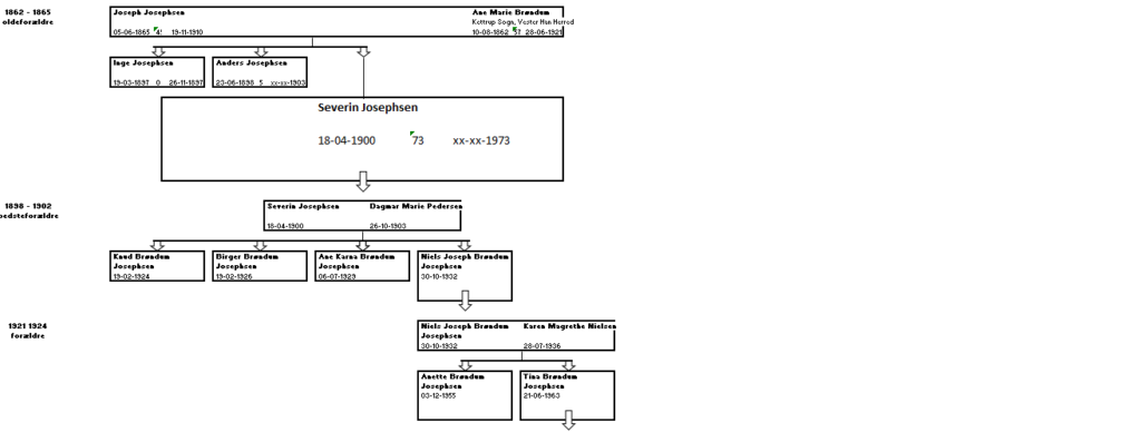 Min farfar Severin Josephsen blev iflg. kirkebogen født den 8. april 1900 i Fjerritslev, Kollerup Sogn, Vestre Hanherred i Nordjylland. Ved dåben står også hans far Joseph Josephsen (min oldefar) købmand af Fjerritslev og hans mor, min oldemor, hustru Ane Marie Brøndum 37 år. Severin, min farfar, blev døbt i hjemmet den 29. april 1900 af sognepræsten Eyermann og fremstillet i Kollerup Kirke den 14. oktober 1900. Som faddere var 1) moderen, 2) huskone Else Kristiansen(Christensen) Brøndum (min farmors farmor), 3) partikulier Anders Josephsen Fjerritslev, 4) kommis Peder Larsen Nielsen Fjerritslev 5) Jens Kr. Kristiansen, Brøndum. Severin, min farfar, var ægteparret Joseph Josephsens og Ane Marie Brøndums 3.barn.